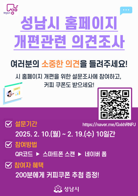 성남시는 오는 2월 19일까지 시 홈페이지 개편과 관련한 시민 온라인 설문조사를 한다.
