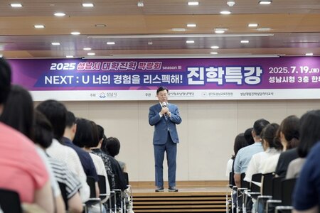 ![]() ▲ 신상진 성남시장이 19일 '2025년 성남시 대학 진학박람회' 특강장에서 인사말을 전하고 있다. © 비전성남 |